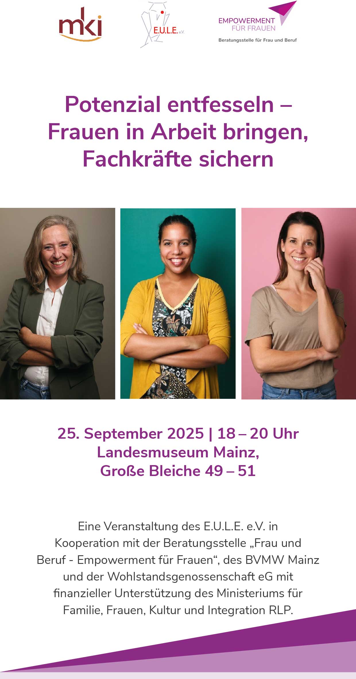 Flyer zur Veranstaltung „Potenzial enfesseln – Frauen in Arbeit bringen, Fachkräfte sicher“
